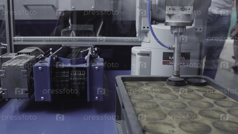 Промышленный робот с конвейером на производственном заводе, промышленность умных фабрик. Робот для распределения металлических изделий во время работы. Современная автоматизированная фабрика
