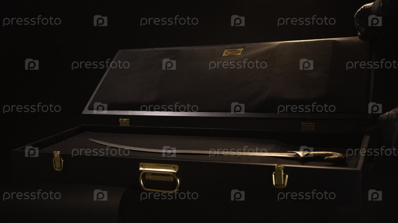 Вид на древний ценный сабель, лежащий внутри деревянного корпуса с золотыми застежками