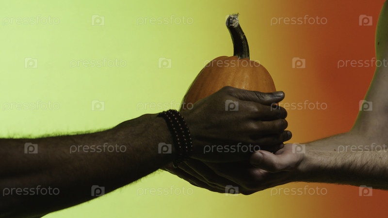 Человек приносит плоды из рук в руки. понятие торговли. чернокожий человек приносит фрукты белому человеку