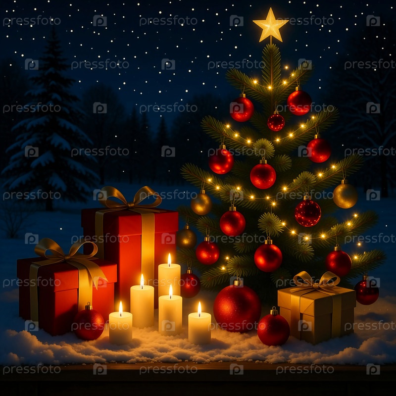 Ярко освещенная рождественская елка, украшенная красными и золотыми ювелирными изделиями, стоит рядом с красиво упакованными подарками и светящимися свечами, создавая теплую праздничную атмосферу в снежную ночь