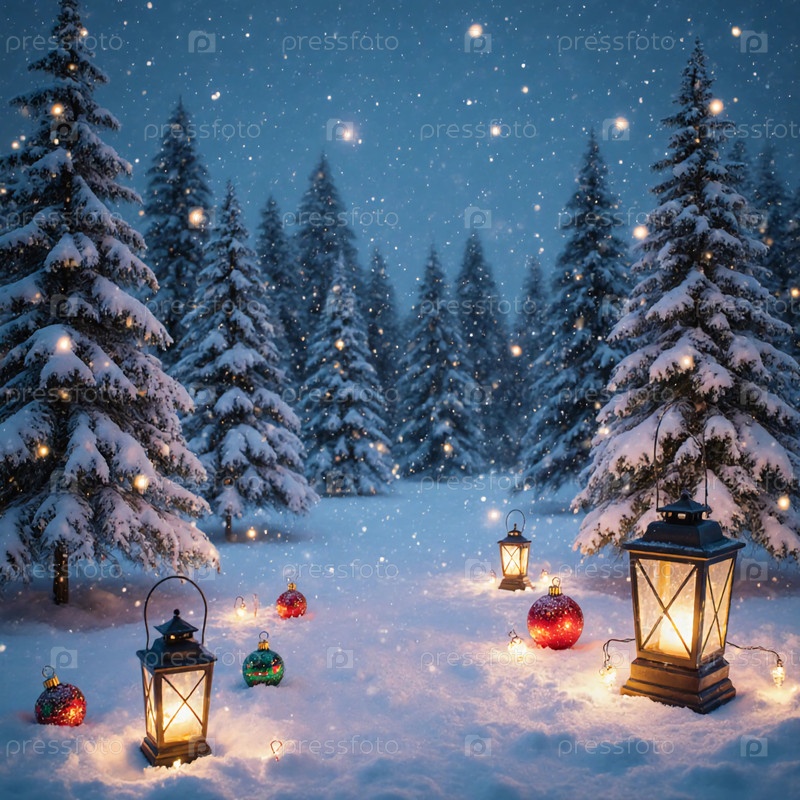 Снежные одеяла - это безмятежный лес, наполненный высокими вечнозелеными деревьями, украшенными красочными орнаментами. фонари освещают заснеженный пейзаж, создавая уютную атмосферу отдыха Generative AI