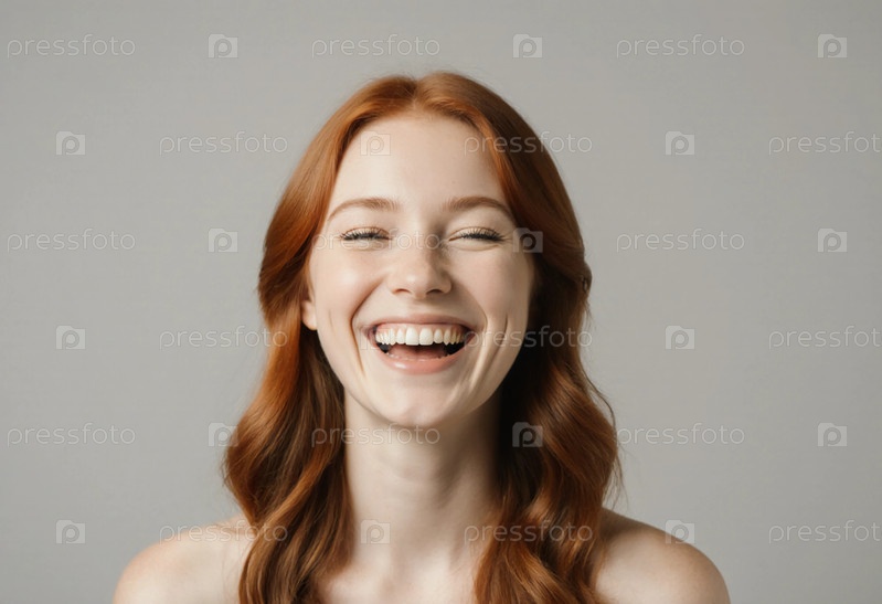 Молодая женщина с рыжими волосами смеется от всего сердца, передавая счастье и теплоту.Его выражение отражает радость и беззаботный дух на нейтральном фоне