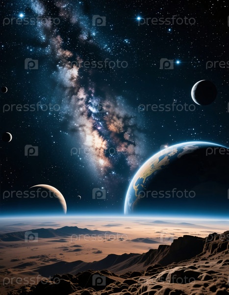 Огромный космос простирается над горизонтом с каменистой местностью внизу, раскрывая несколько планет и яркую галактику на темном небе.Звезды мерцают на небесном фоне Generative AI