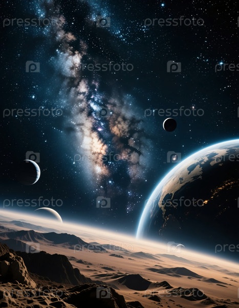 Потрясающий вид глубокого космоса показывает несколько планет, вращающихся вокруг прекрасной Земли.Светлая галактика Млечный Путь сияет над песчаной местностью генеративного ИИ