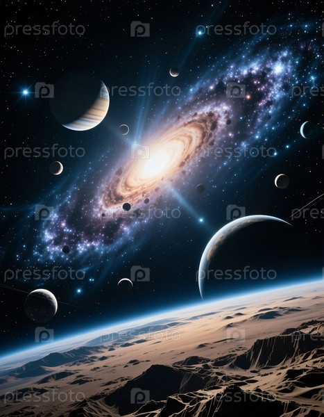 Яркие звезды и вращающийся газ иллюстрируют красоту спиральной галактики в космосе.Несколько планет вращаются вокруг необъятности пространства над текстурированным ландшафтом, внушая благоговение генеративному ИИ