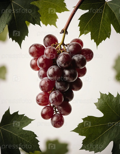 Зрелые красные виноград висят на лозе, демонстрируя богатый цвет и блестящую отделку.Зелёные листья образуют кластер, создавая свежий яркий внешний вид в простой среде
