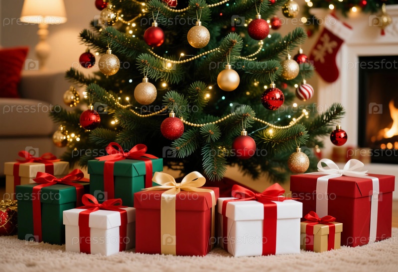 Красочные коробки для подарков аккуратно размещены под рождественской елкой, украшенной орнаментами и мерцающими огнями, создавая теплую и праздничную атмосферу в гостиной Generative AI