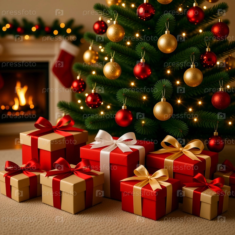 Красочные коробки для подарков сидят под сверкающей рождественской елкой, украшенной светящимися огнями и блестящими декорациями. теплый камин добавляет к уютной атмосфере комнаты генеративный ИИ