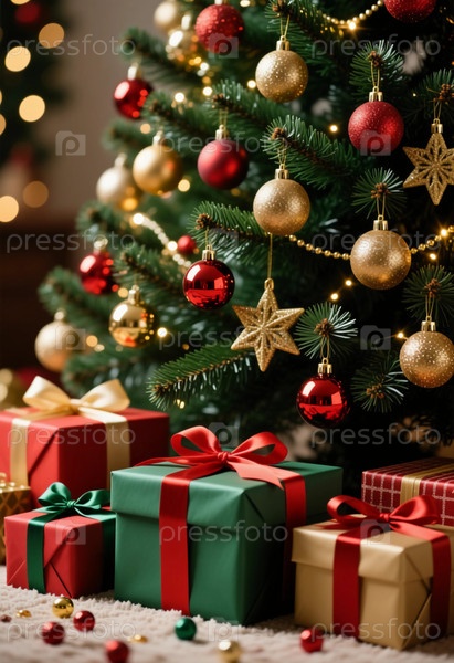Подарки аккуратно размещаются под красиво украшенной рождественской елкой, которая украшена блестящими орнаментами и добавляет к праздничной атмосфере новогодних торжеств