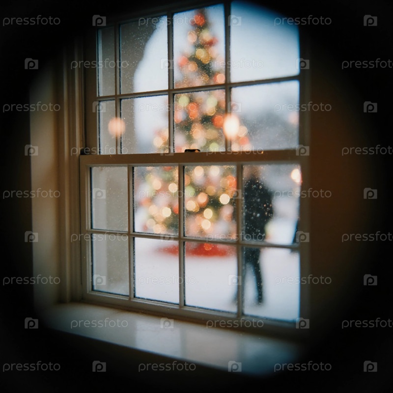 Красивая рождественская елка с яркими украшениями и красивой гирляндой видна через окно.Сцена отражает радость зимы и дух праздника Генеративный AI