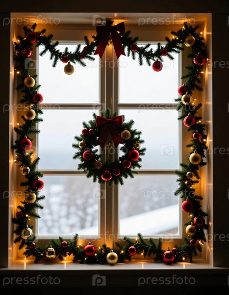 Очаровательное окно отображает праздничную гирлянду с шариками рождественской елки, создавая теплую атмосферу, идеально подходящую для празднования новогоднего сезона генеративного ИИ
