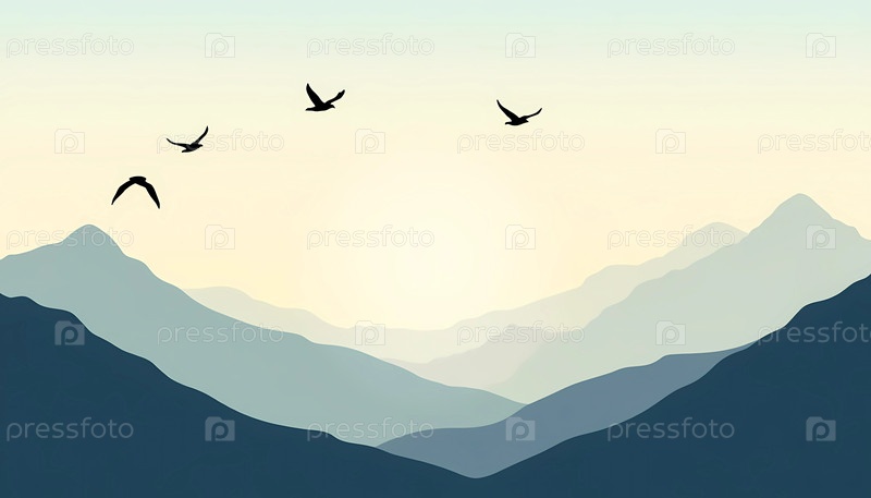 С рассветом несколько птиц легко пролетают по обширному небу, окруженному величественными горами, которые мягко поднимаются на заднем плане