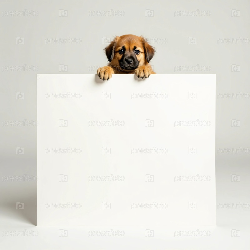 Игровое щенко с пушистой шерстью заглядывает на большое чистое полотно, излучающее очарование и радость