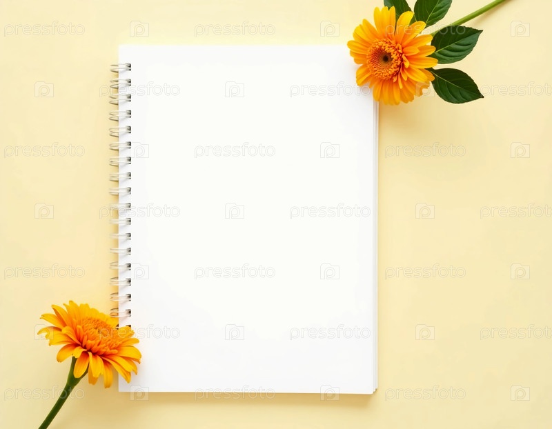 В центре лежит пустая тетрадь, а яркие цветы календулы добавляют блеск оранжевого цвета с обеих сторон.Мягкий пастельный фон приглашает вдохновение и творчество в любой момент