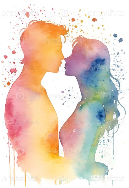 Молодая пара делится нежным поцелуем, окруженная мягкими оттенками акварели, захватывая момент любви и близости в ярком художественном выражении