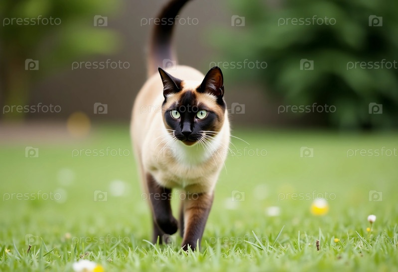 Красивая сиамская кошка блуждает по ярко-зеленой лужайке, солнечный свет мерцая на ее гладкой шерсти