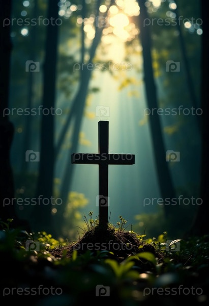 В спокойном лесу солнечный свет фильтрует деревья, выделяя деревянный крест в окружении пышной зелени и создавая мирную атмосферу