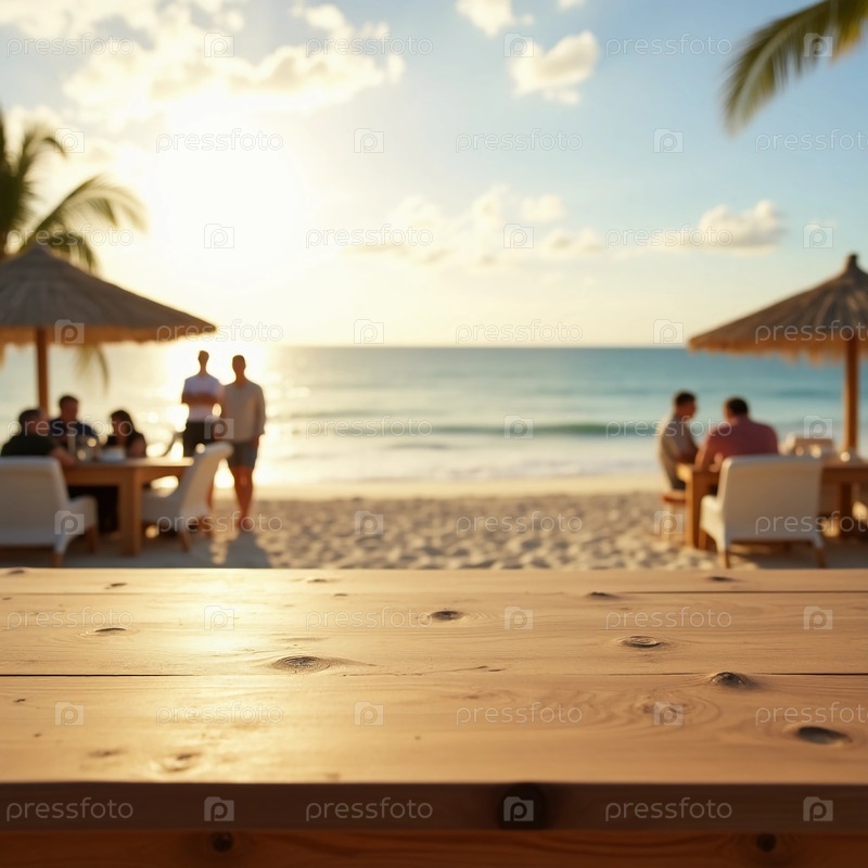 Золотой свет танцует на деревянных столах, установленных на мягких песчаных берегах, в то время как люди наслаждаются расслабляющим пляжным собранием