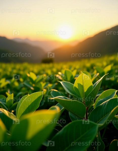 Золотые солнечные каскады в холмах, когда свежие чайные листья сияют утром, создавая захватывающий пейзаж растущего генерирующего ИИ