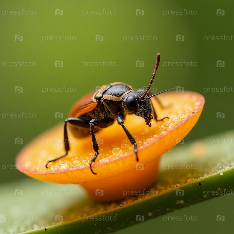 Небольшое черное насекомое исследует ярко-оранжевую капсулу гриба, окруженную богатым зеленым фоном, демонстрируя сложные детали природы в солнечный день