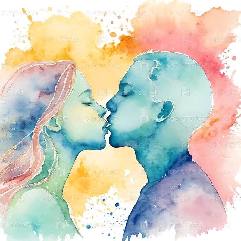 Страстная любовь, запечатленная в акварельном объятии между молодой парой, разделяющей нежный поцелуй на ярком фоне цветов