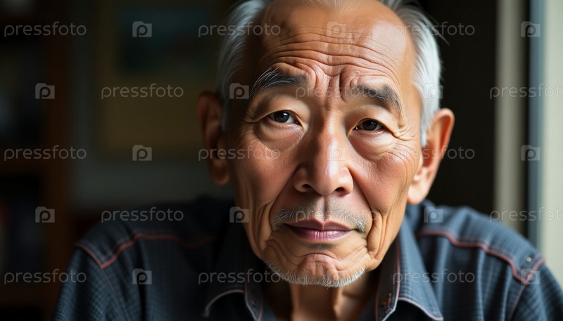 Пожилой китайский мужчина сидит вдумчиво, демонстрируя глубокие линии мудрости и опыта