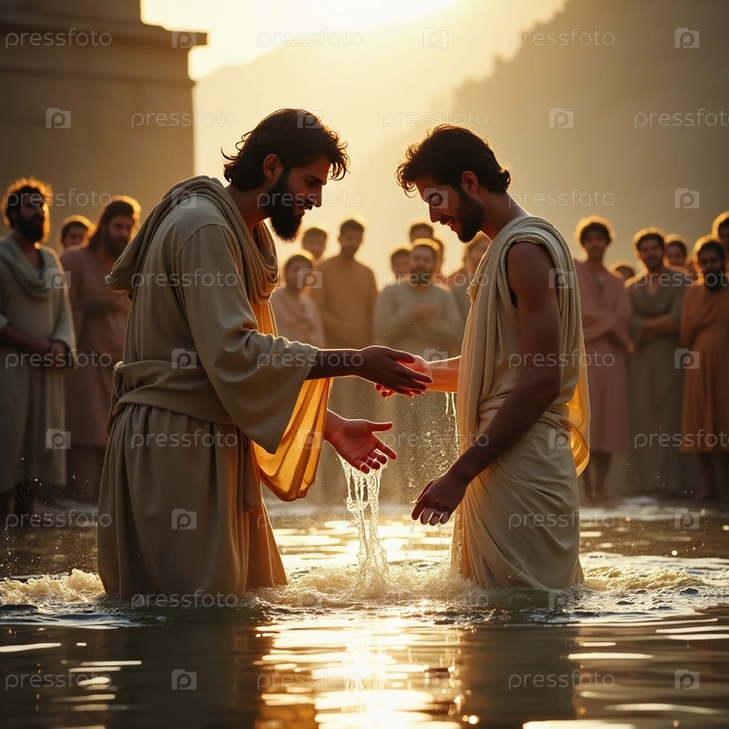 В спокойный момент у реки Иордан Иоанн Креститель крестит Иисуса, когда люди стоят на берегу и наблюдают за этим историческим событием при закате солнца