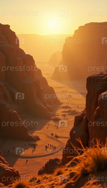 Закат омывает шероховатую местность древних земель золотыми оттенками, когда группы странников пересекают извилистые тропинки исторической долины, вызывая чувство вневременности и наследия