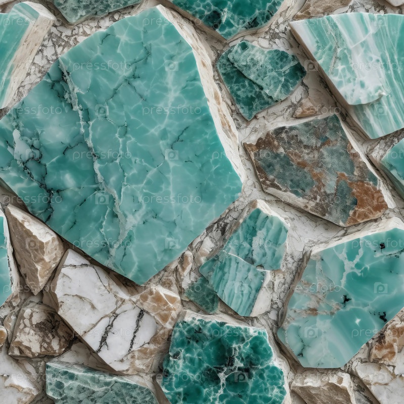 Уникально сформированные и ярко окрашенные камни амазонина плавно переплетаются, демонстрируя сложные узоры и оттенки зеленого и синего, раскрывая мастерство природы Generative AI