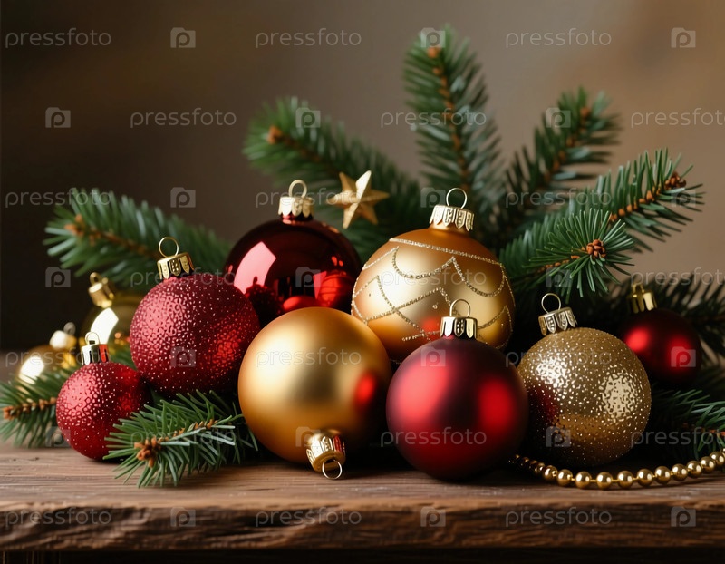 Красочные рождественские шары в красном, золотом и блестящем дизайне отдыхают на деревянном столе, окруженном зелеными ветвями сосны, вызывая праздничное настроение к Рождеству и Новому году
