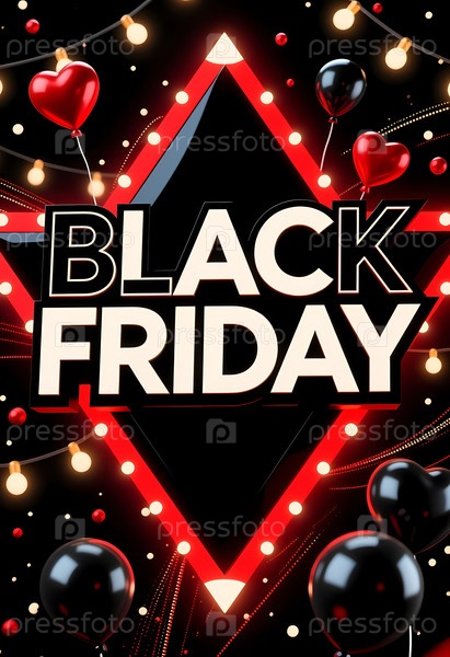 Черная пятница приносит живые декорации с красными и черными шариками, формами сердец и светильниками на темном фоне, создавая праздничную атмосферу покупок Generative AI