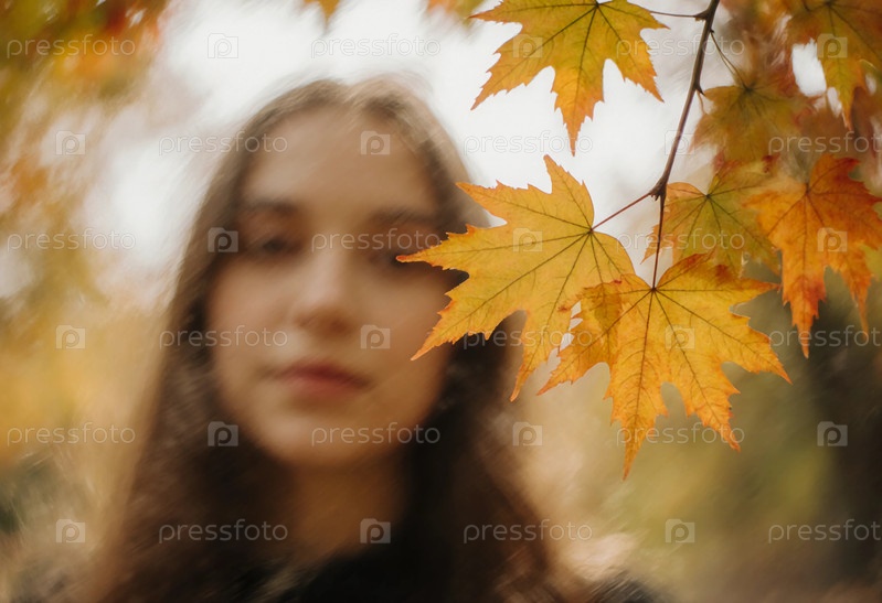 Молодая женщина стоит в спокойной обстановке, окруженная яркими осенними кленовыми листьями.Сцена слегка размыта, подчеркивая яркие цвета осенних листочков генеративного ИИ