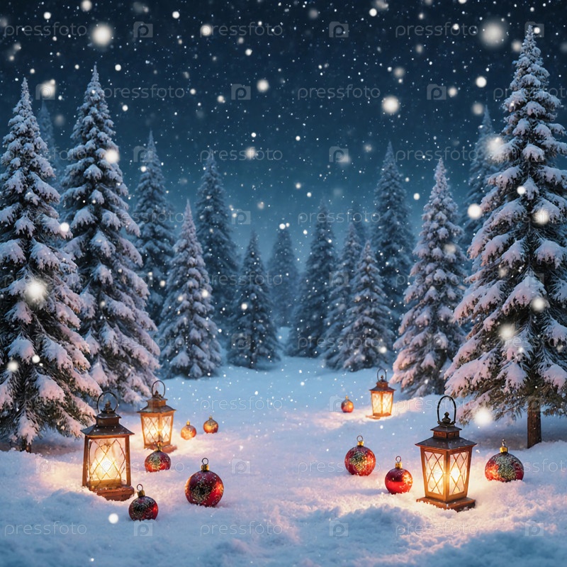 В спокойном зимнем пейзаже высокие сосны, покрытые снегом. фонари освещают дорожку, а красочные декорации добавляют очарование, создавая праздничную атмосферу на закате генеративного AI