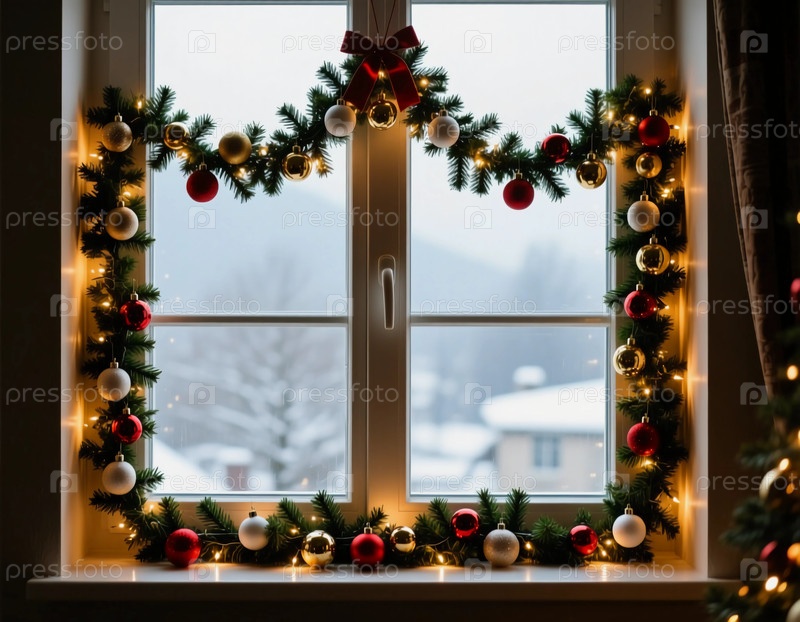 Праздничное окно украшено гирляндой вечнозеленых и красочных пузырей, освещенных мягкими огнями, празднующими Рождество и Новый год