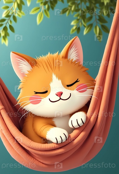 Пушистый оранжевый кот тихо отдыхает в мягком гамаке, глаза закрыты и его лицо украшает содержательная улыбка, а тонкие листья качаются рядом с ним под теплым светом