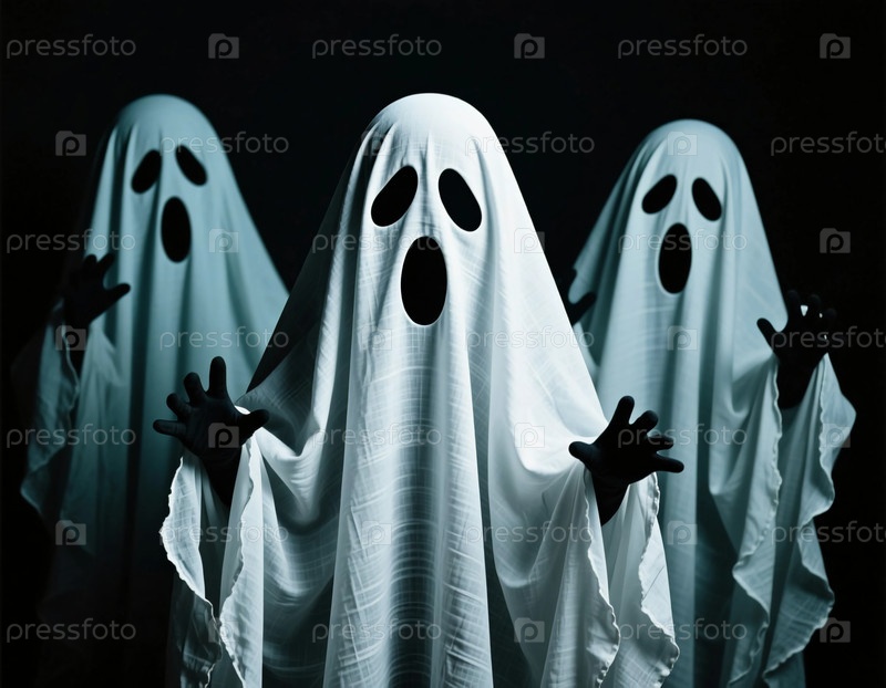 Три призрачные фигуры, одетые в белые простыни, открывают рот и руки, создавая жуткую сцену.Темный фон улучшает загадочную атмосферу генеративного ИИ на Хэллоуин