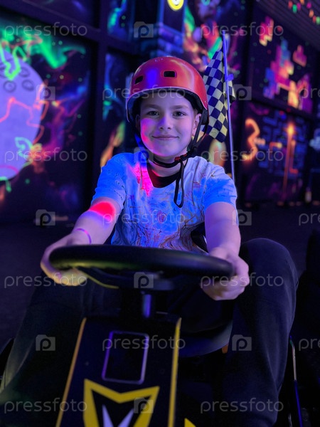 Молодой мальчик счастливо улыбается, когда едет на карте в неонной арене с черным светом