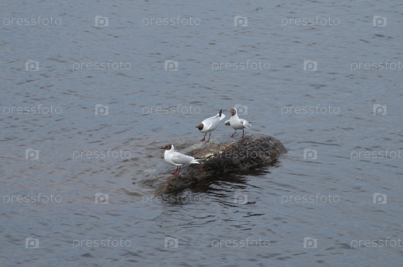 Три черноголовых чайки (лат. Ichthyaetus melanocephalus) вид птиц из рода Ichthyaetus семейства чайков (Laridae), сидят на скале, окруженном водой