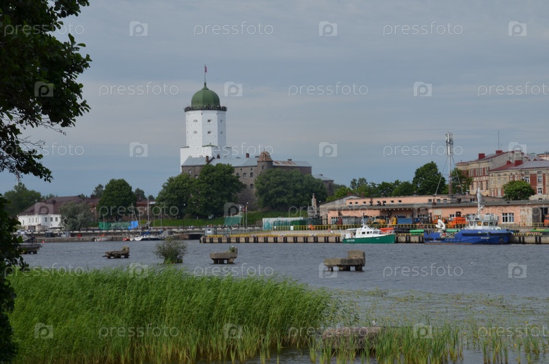 Вид на древний город Выборг: Выборгский замок, старинное сооружение набережных, Крепостной мост, водный район южной гавани Вyborg Bay
