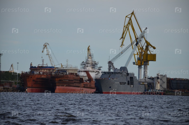 Вид на завершенные дамбы Выборгской верфи: корабли в стадии строительства и ремонта, краны, доки