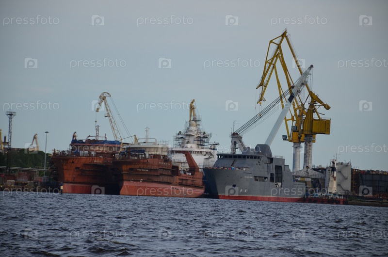 Вид на завершенные дамбы Выборгской верфи: корабли в стадии строительства и ремонта, краны, доки