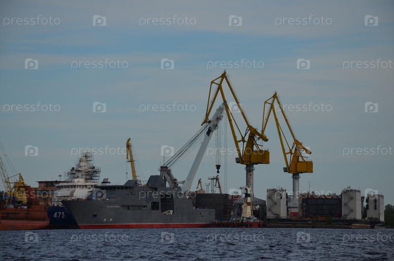 Вид на завершенные дамбы Выборгской верфи: корабли в стадии строительства и ремонта, краны, доки