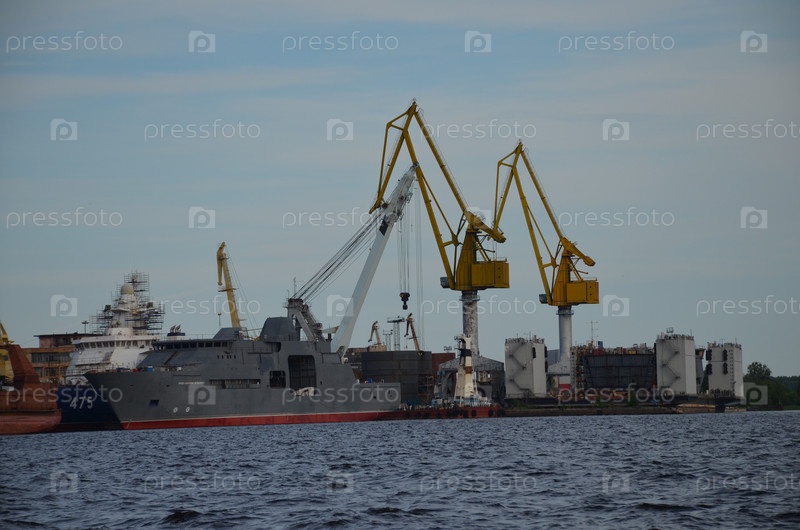 Вид на завершенные дамбы Выборгской верфи: корабли в стадии строительства и ремонта, краны, доки