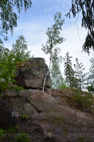 Падающий камень и береза, поддерживающая его в парке Монрепо в Выборге, Ленинградская область