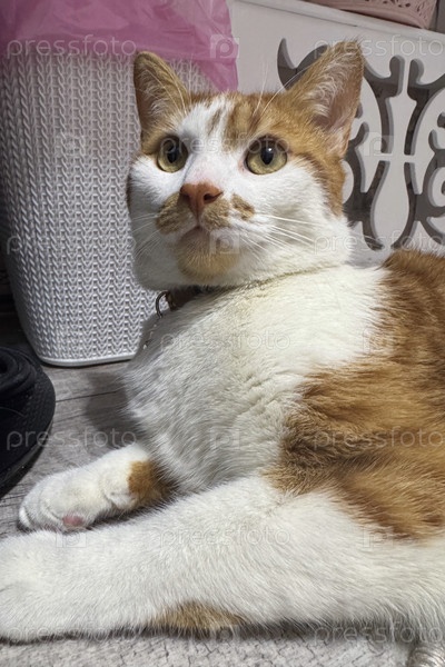 Красно-белый кот лежит величественно на полу, ноги вытянутыми вперед и смотрит сквозь камеру