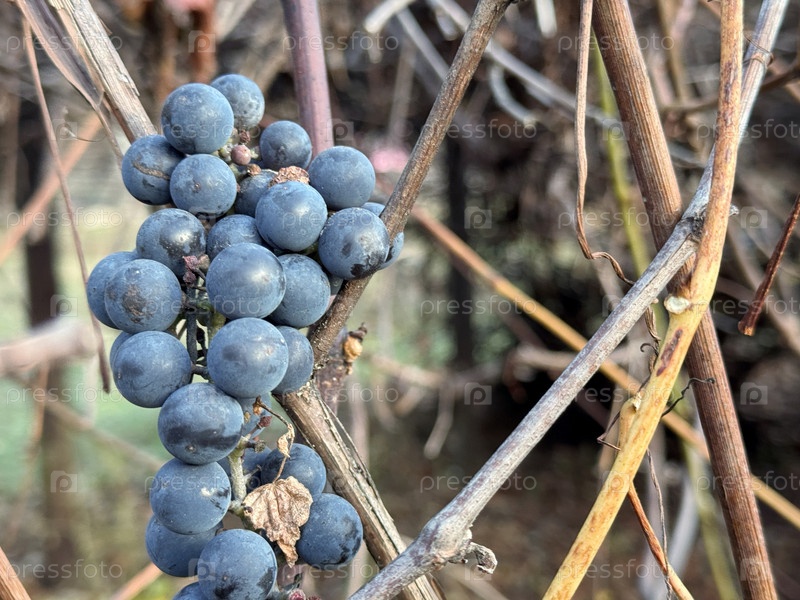 Группа спелых викторианских виноград на лозе осенью. близко. виноградник в конце октября, увядающие листья