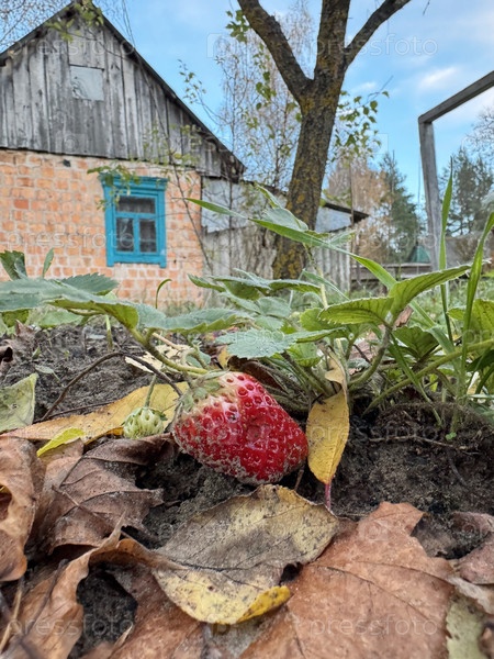 Красная незрелая ягода клубники на кусте. поздняя осень