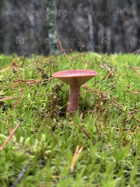 Lactarius deliciosus растет в зеленом мхове. В сосновом лесу. Осенний грибный корм