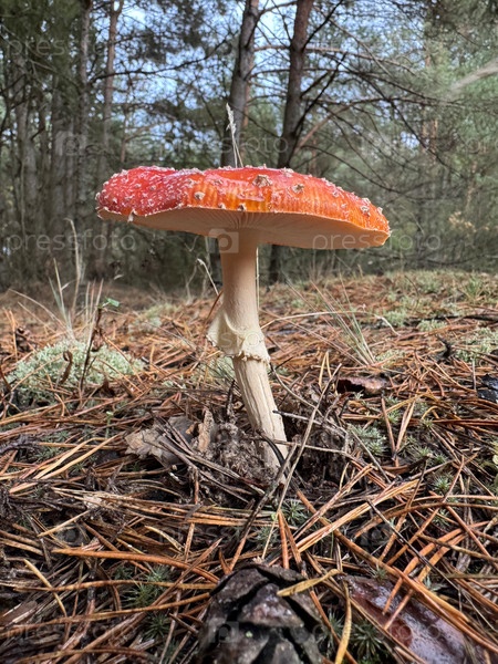 Агар-гриб красной мухи растет в мхе соснового леса.Снято с уровня земли