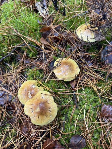 Семейство грибов, растущих в зеленом мохе среди упавших сосновых игл